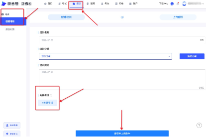 2.点击「关联考试」设定哪一场考试的考生可以看到本次培训内容。创建完成培训后,点击「保存并上传附加」添加课件附件。